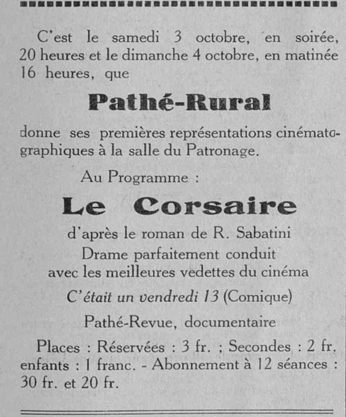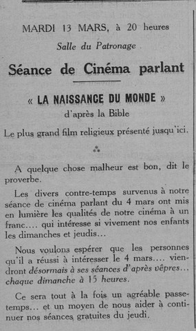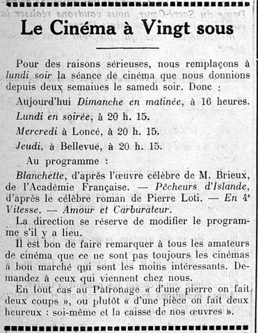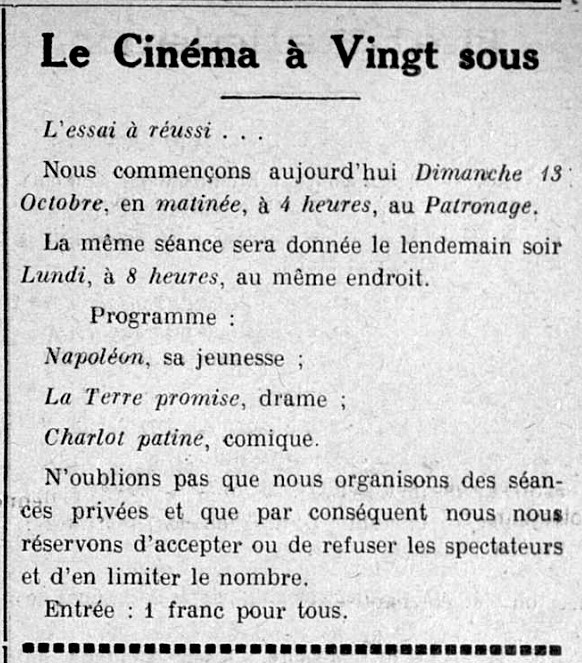 "Ceci, c'est du nouveau ! Ceci, c'est un essai réussira-t-il ? Oui, si dès cette semaine, pas de pitié pour les retardataires, on s’engage à assister aux 20 séances de cinéma que Mr le Vicaire veut bien organiser pour les amateurs de bon cinéma, moyennant le prix dérisoire 1 franc par séance, ou mieux, l’abonnement de 18 francs pour les 20 séances. Ne confondons pas ! Il y à cinéma et cinéma.