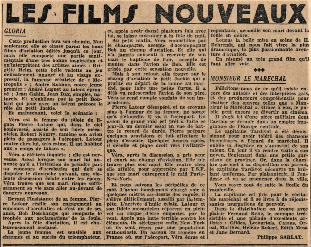 Le 26 novembre 1938 à 20h a lieu l'inauguration du nouvel appareil de cinéma, sous la direction d'un ingénieur de Pathé-Cinéma. Ce nouvel appareil est entièrement sonore et parlant. Le prix des places est de 3 francs pour les grandes personness et 2 francs pour les enfants. Au programme la semaine suivante : "Gloria", un film à la gloire de l'aviation civile.
