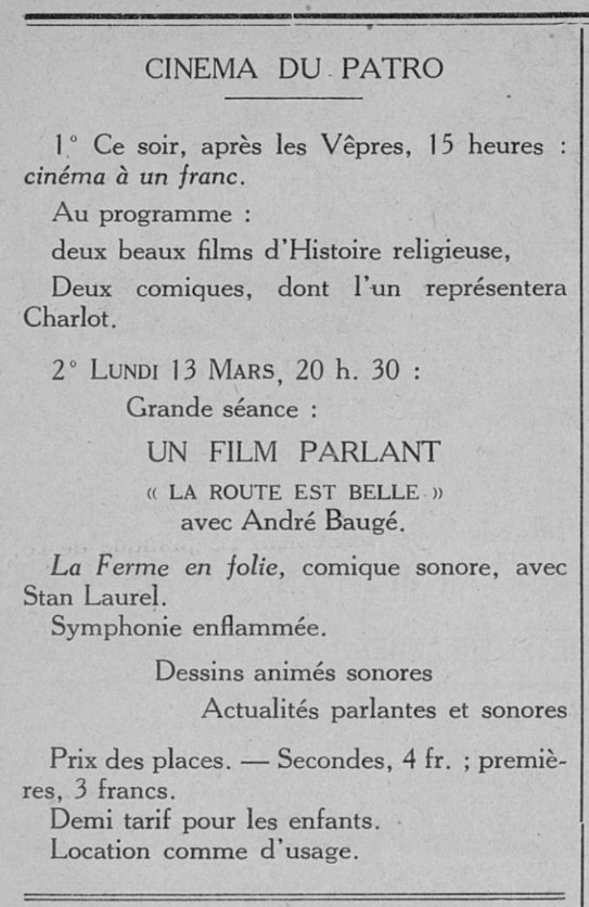 Le 5 février 1933, à 15h00 au Patro, c'est l'inauguration d'un nouveau projecteur de cinéma : un appareil plus grand, plus lumineux, ultra au point... avec un programme de tout premier choix pour la modique somme de 1 franc, chaque dimanche à 15h00. Un mois plus tard, c'est la projection du premier film parlant "La route est belle" avec André Baugé.