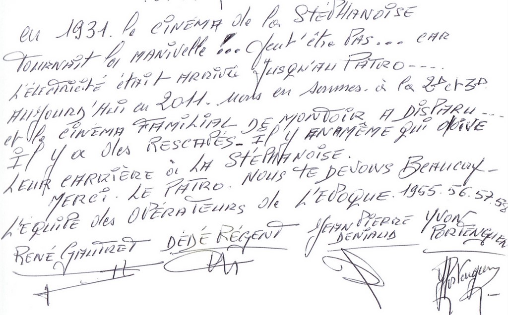 Les séances de "cinéma à vingt sous" sont données le dimanche à 16h et le lundi à 20h au patronnage de Montoir, le mercredi à 20h15 salle Lambert puis chez Mme Lebel à Loncé, le jeudi à 20h15 à Bellevue, également le mardi à 20h15 au Village, salle LEGOUT à Camée, puis chez Melle Lucie LERAY. On s'asseyait sur des bancs en bois, pas vraiment confortables, mais le public était content, les recettes étaient versées à La Stéphanoise qui organisait les projections.