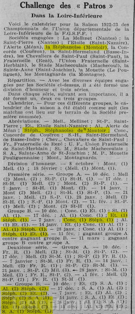 1922 Le challenge des patros en Loire-Inférieure. La Stéphanoise équipe 1 joue en première série groupe B et l’équipe 2 en deuxième série. (calendrier des rencontres ci-contre).(voir le règlement du championnat).