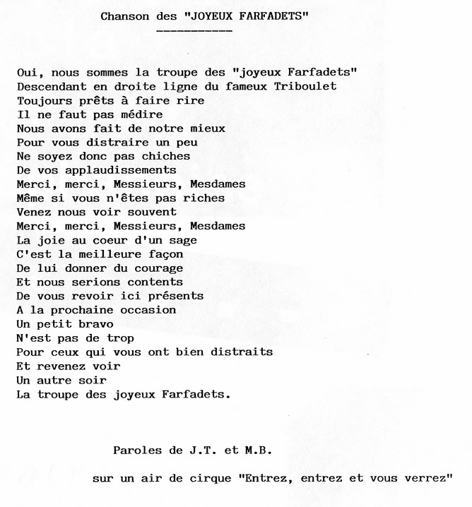 Le spectacle s'achevait toujours par le chant composé par deux acteurs et interprété par toute la troupe (La chanson des Joyeux Farfadets).